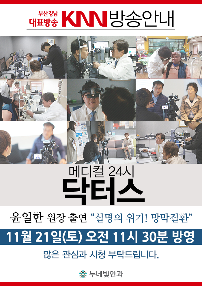 망막질환 권위자인 본원의 윤일한 원장이 <KNN 메디컬 24시 닥터스> '실명의 위기! 망막질환'편에 출연합니다. 많은 관심과 시청 부탁드립니다.